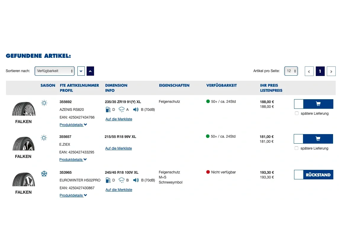 From orders to stock levels, price information and customer information - the B2B platform is directly connected to Falken Tyre's ERP system. This ensures that all relevant data is available in real time.