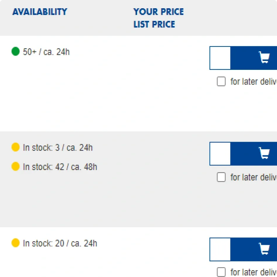 Based on the customer's location, Europe-wide warehouse locations are segmented according to delivery availability and distance. The customer is thus informed directly and transparently which delivery dates are possible.