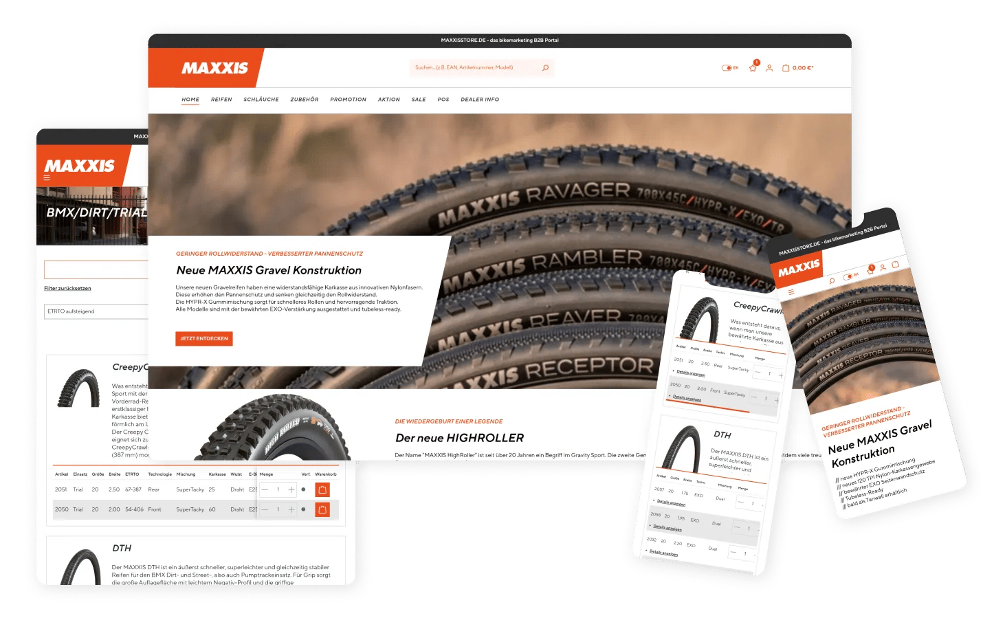Together with Bikemarketing BMG GmbH, the exclusive importer of MAXXIS bicycle tyres in Germany and Austria, we realised the relaunch of a future-proof B2B commerce platform.The aim was to create a high-performance, user-friendly shop that is not only visually appealing, but above all optimises the sales process - from login to shopping cart with maximum grip.