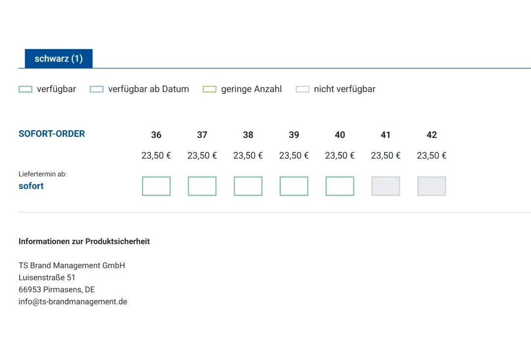 This is why all available sizes, colours and models, as well as the corresponding availability, are displayed at a glance. Delivery dates are displayed transparently, enabling reliable purchasing planning.