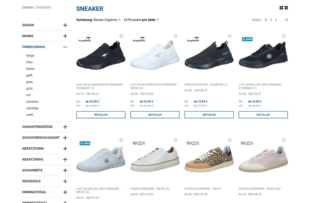 In the shoe trade, extensive search and filter functions for a full range of thousands of articles are a must-have. All properties and attributes are taken directly from the ERP system.