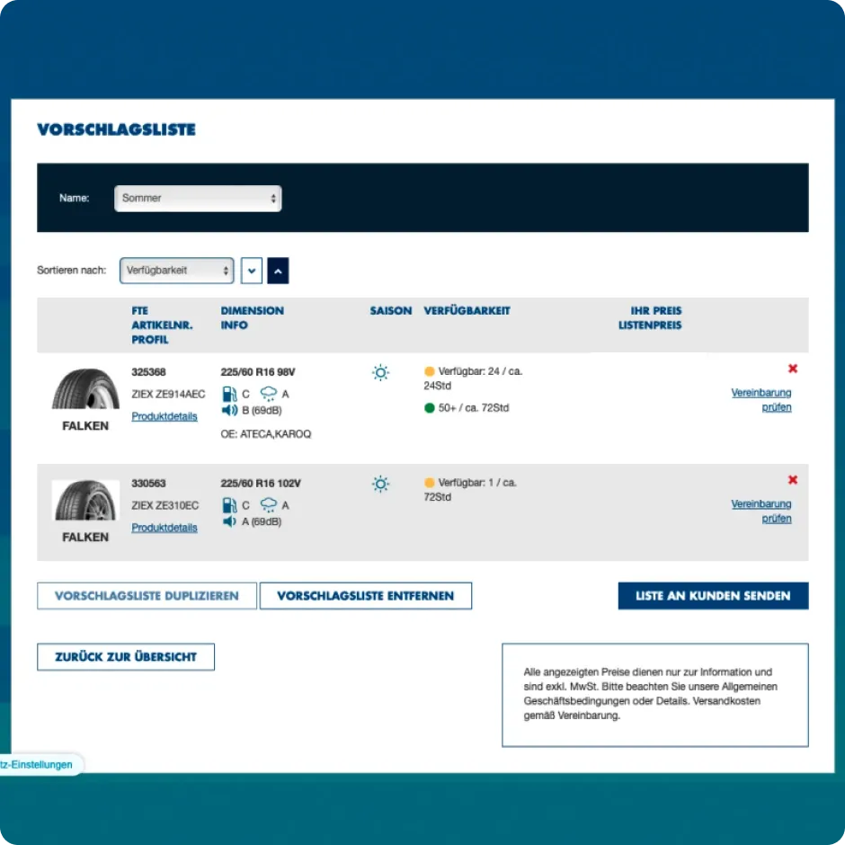 Von Bestellungen über Lagerbestände, Preisinformationen bis hin zu Kundeninformationen - die B2B-Plattform ist direkt an das ERP-System von Falken Tyre angebunden. Dies stellt sicher, dass alle relevanten Daten in Echtzeit zur Verfügung stehen.