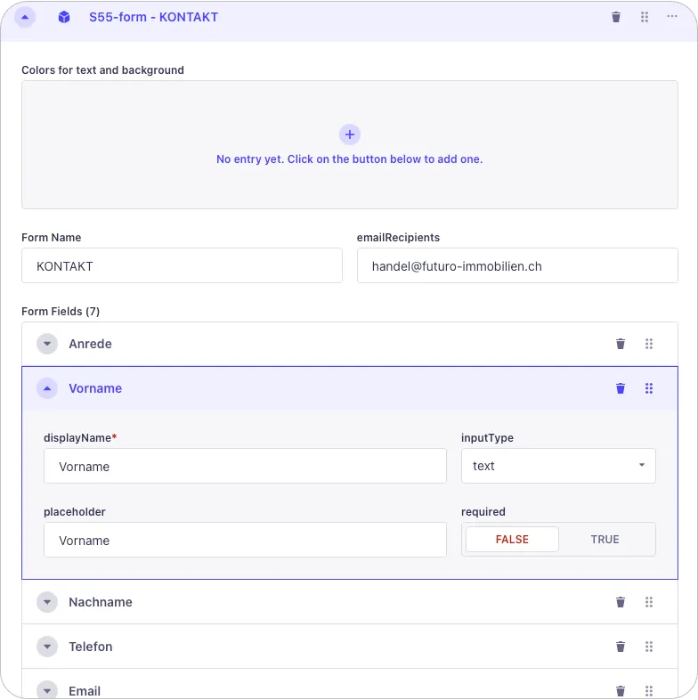 Mit einem weiterem Go-To Plugin ermöglicht Strapi ein einfaches zusammenklicken von Formularen. Vordefinierte Felder können beliebig ausgewählt und verändert werden, ganz nach Bedarf. Die Prüfung auf Pflichtangaben erfolgt automatisch.