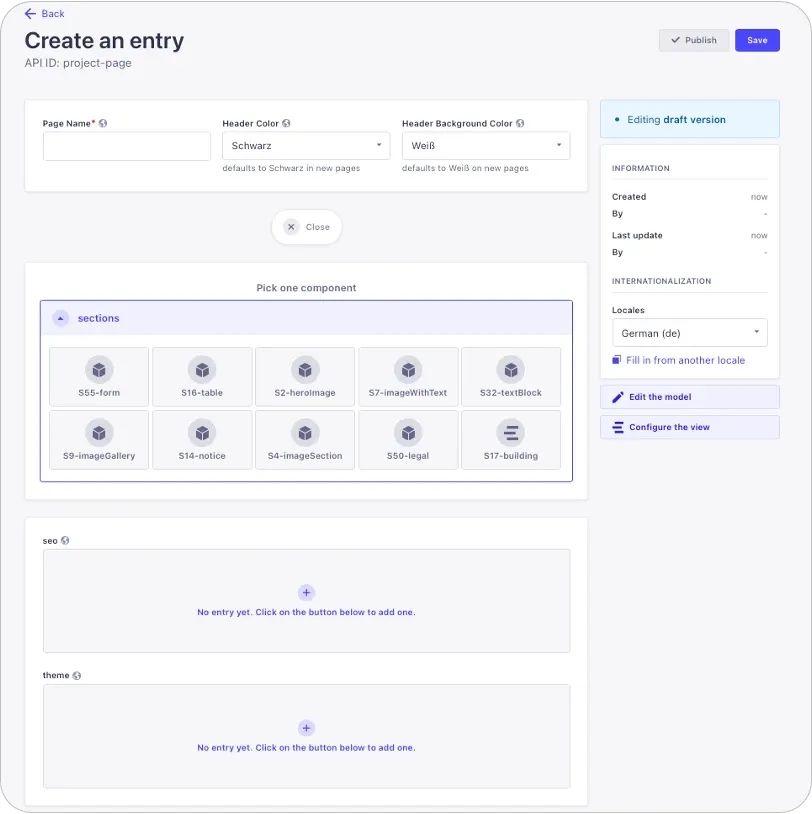 Das Strapi CMS stellt für viele Content-Cases vorgefertigte Inhalts-Komponenten bereit und vereinfacht die Erstellung und Bearbeitung. Direktvisualisierung für Inhalte und Drag & Drop Funktionen unterstützen den Editor zusätzlich.